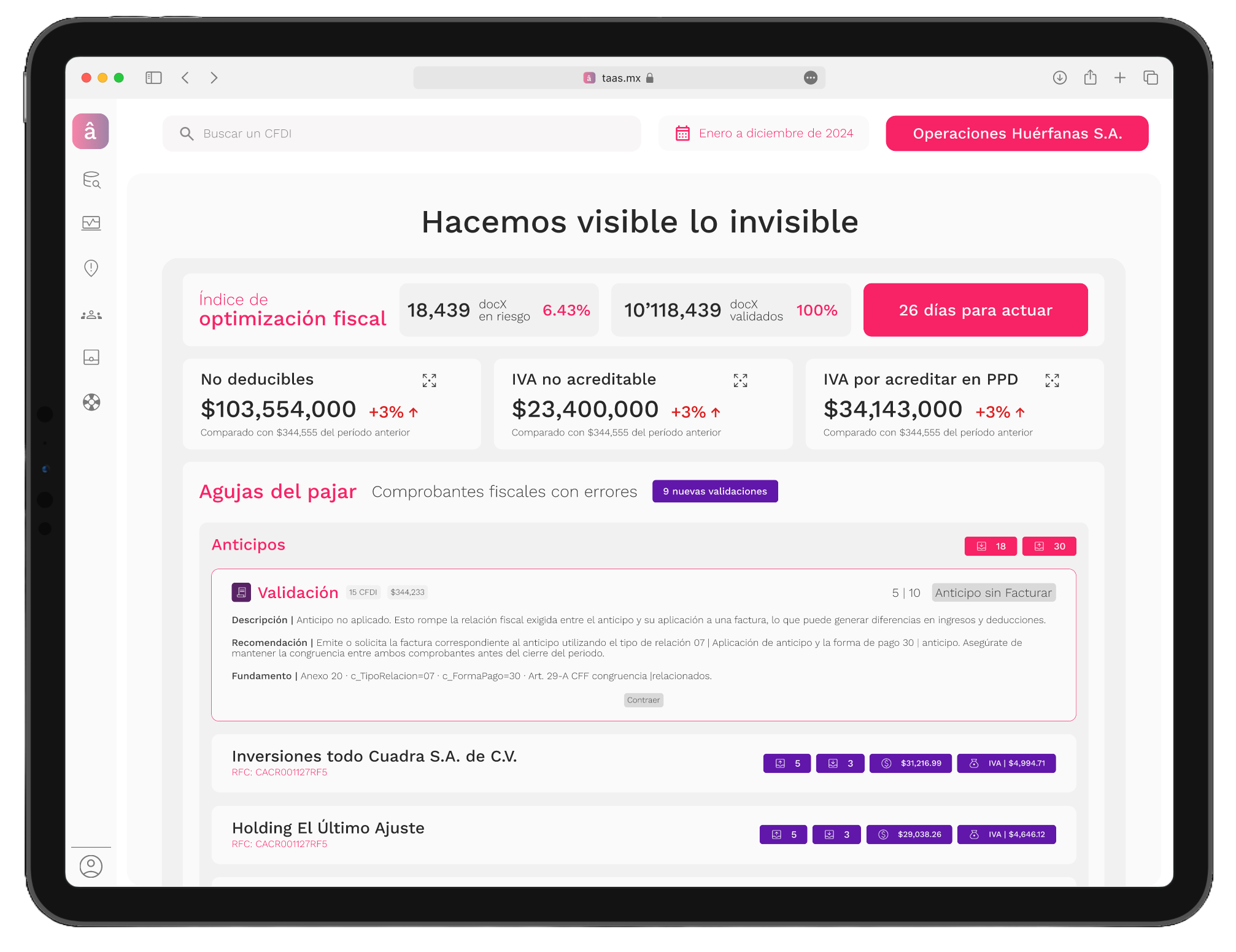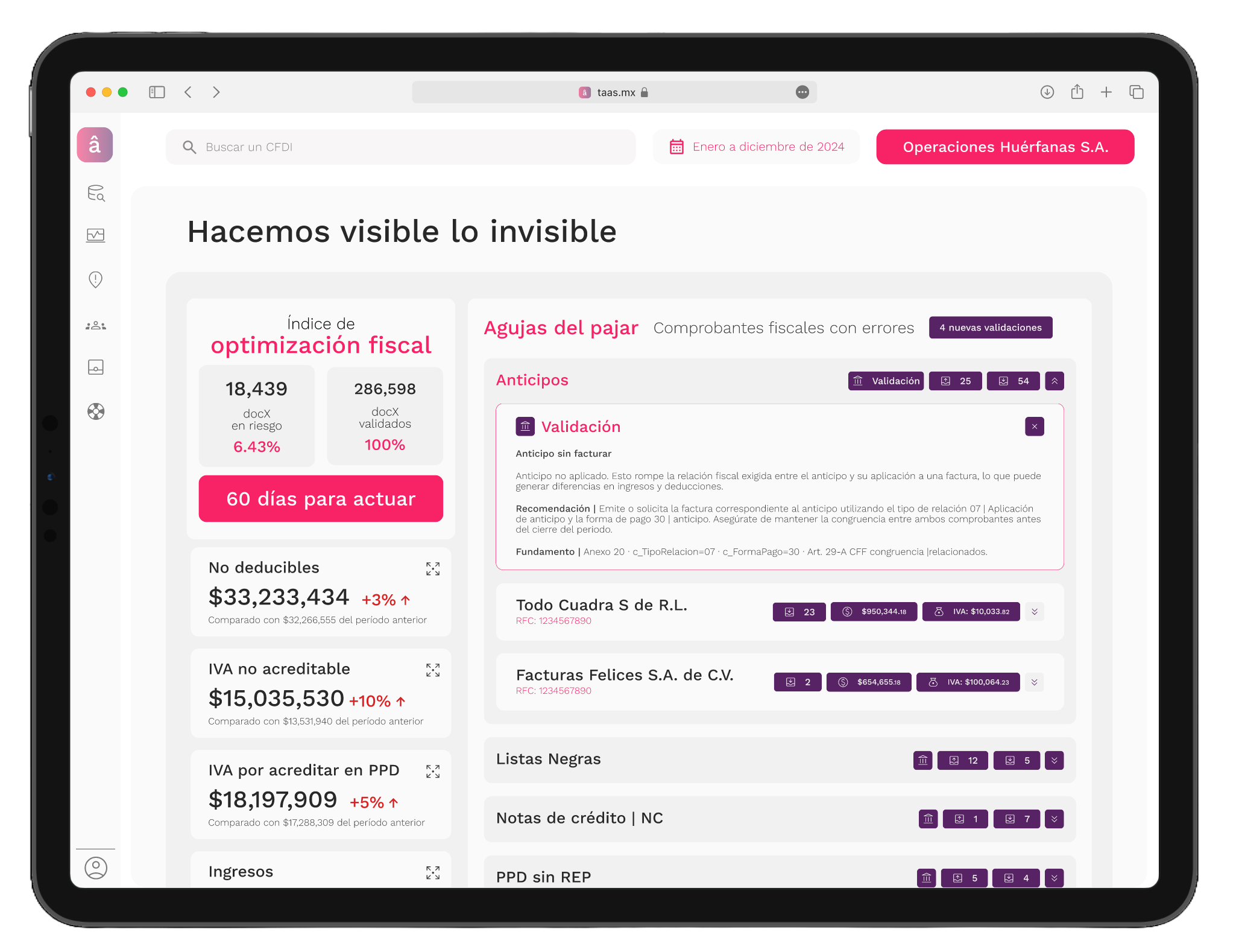 Cada validación, alerta o riesgo invita a tomar acciones para asegurar deducciones y acreditaciones, y sobre todo, ganar visibilidad, claridad, certeza y tranquilidad.