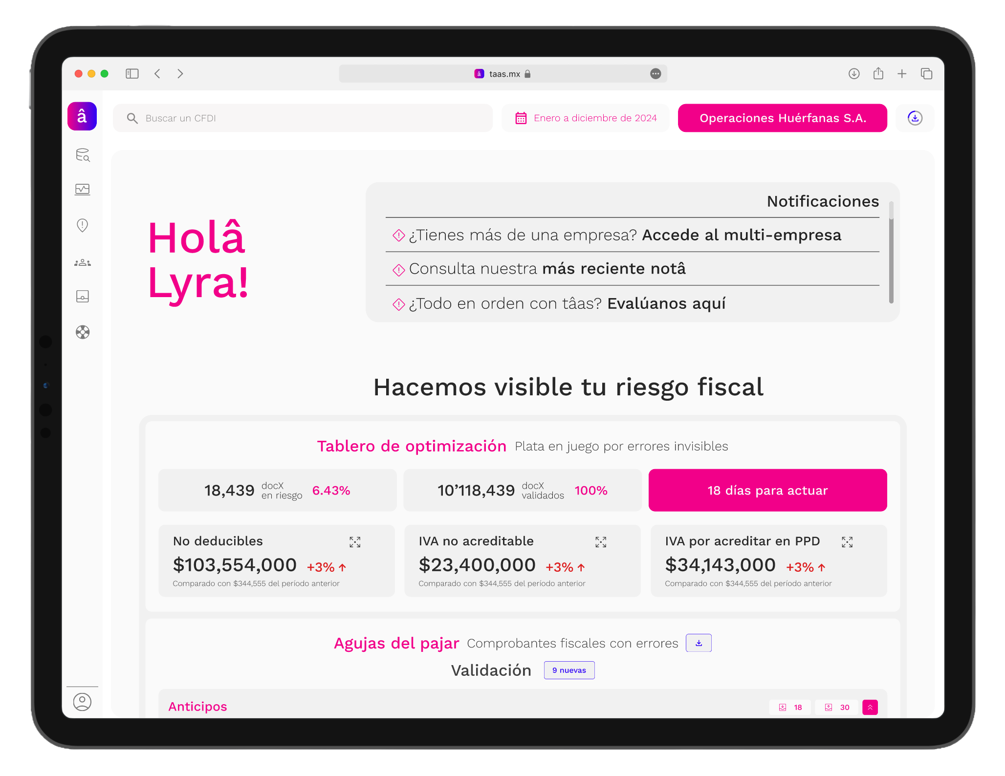 tâas te alerta sobre comprobantes con irregularidades y te ofrece recomendaciones específicas para resolver cada situación antes de que se convierta en una contingencia fiscal.